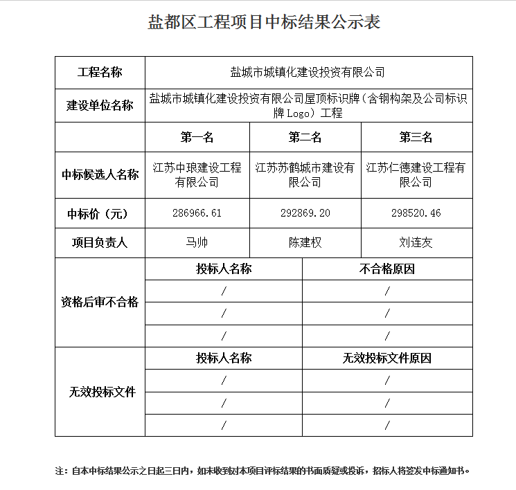 鹽城市城鎮(zhèn)化建設投資有限公司屋頂標識牌(含鋼構架及公司標示牌Logo)工程中標公示