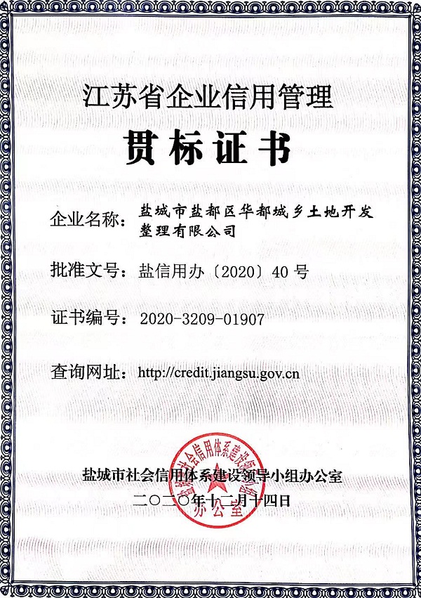 根據(jù)《“十三五”期間深入推進(jìn)全省企業(yè)信用管理貫標(biāo)和示范創(chuàng)建工作實施意見的通知》(蘇信用辦〔2016〕39號)和《關(guān)于組織開展2020年度企業(yè)信用管理貫標(biāo)和示范創(chuàng)建工作的通知》(鹽發(fā)改信用〔2020〕49號)要求,經(jīng)企業(yè)申請、各縣(市、區(qū))推薦和第三方信用服務(wù)機構(gòu)實地評價等程序,我集團(tuán)子公司鹽城市鹽都區(qū)華都城鄉(xiāng)土地開發(fā)整理有限公司符合2020年度省信用管理貫標(biāo)企業(yè)認(rèn)定標(biāo)準(zhǔn),榮獲江蘇省企業(yè)信用管理貫標(biāo)證書。
