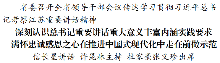 信長星指出,習近平總書記考察江蘇重要講話,統(tǒng)攬全局、指航定向,言近旨遠、語重心長,是強國建設、民族復興宏偉藍圖在江蘇的具體化。要深刻領會總書記對江蘇一系列重要講話重要指示,在追根溯源中厘清脈絡,在融會貫通中掌握要義,在一體落實中求取實效,做到學習貫徹更加全面、更加系統(tǒng)、更加深入。要深刻領會總書記對江蘇工作的勉勵,提高政治站位,保持清醒頭腦,堅定信心決心,把已經取得的成績作為新的起跑線,持續(xù)補短板、強弱項、固底板、揚優(yōu)勢,用實實在在的發(fā)展成果實現(xiàn)更大突破、增創(chuàng)新的優(yōu)勢。要深刻領會總書記對江蘇明確的重大定位,把握“走在前、做示范”的豐富內涵,知重負重、擔當作為,在中國式現(xiàn)代化道路上勇于率先實踐、積累經驗。要深刻領會總書記對江蘇工作提出的重大任務,“四個新”既著眼中國式現(xiàn)代化戰(zhàn)略全局,又體現(xiàn)江蘇的基礎、優(yōu)勢和地位,是對江蘇工作要求的再明確、再拓展、再深化,必須逐條認真領會、深入調查研究,謀深謀實、落細落成。要深刻領會總書記對主題教育提出的最新要求,匡正干的導向、增強干的動力、形成干的合力,凝心聚力促發(fā)展,乘勢而上開新局,推動高質量發(fā)展和現(xiàn)代化建設邁上新臺階、展現(xiàn)新氣象。